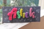String art Name Board is a type of artwork that involves creating a decorative sign using string or thread. The process involves wrapping the string or thread tightly around nails or pins that have been placed in a wooden board or canvas to form the desired shape or letters of the name or word being represented.